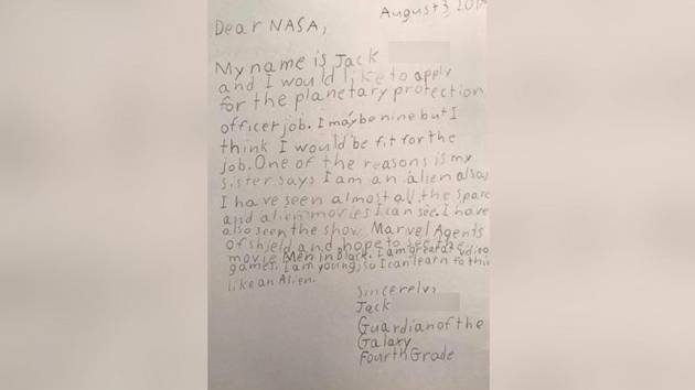 (NEW YORK) — A 9-year-old alien enthusiast from New Jersey sent a handwritten letter to NASA asking to be considered for a job working with astronauts.