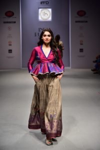 The collection in Tussar silk was inspired by the people who migrate to bigger cities in search of a better life but do not forget their roots and still want to be recognized from their village or town. Taking a cue from this feeling, Poonam created 10 styles in natural earthy colors like beige, white, grey and slightly moving towards hues like blue and magenta that truly exhibit the beauty and rustiness of the villages. Banka Silk’s show is a powerful story of a progressive and new age fashion. The highlight of the show was the treatment of handmade Mughal monuments embellishment on their creations with the use of block prints, hand painting, surface ornamentation and ornate textures on Tussar silk and linen and using weaving and traditional hand processes to achieve radical shapes.
