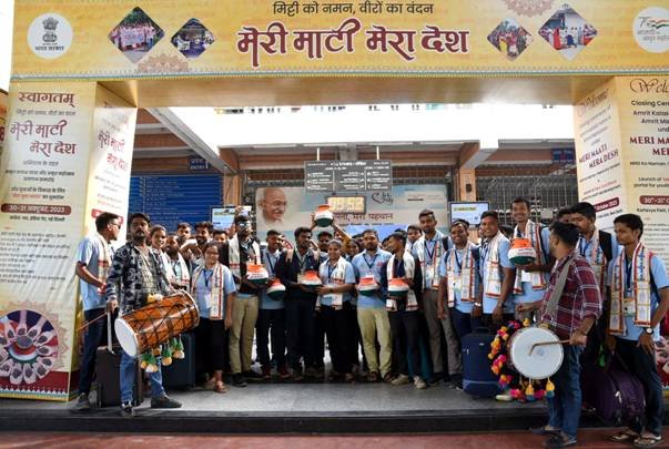 Karnataka delegation, infused with zeal, arrive at Hazrat Nizamuddin Railway Station, Delhi to participate in the final leg of ‘Meri MaatiMeraDesh’ campaign