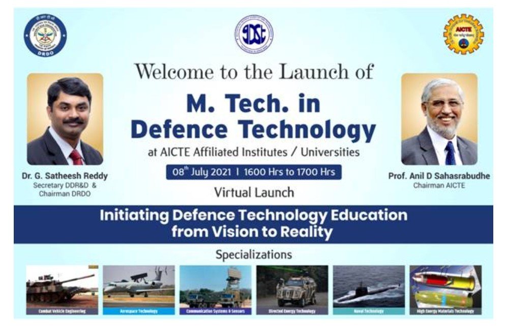 A regular M.Tech. Program in Defence Technology has been launched by Defence Research and Development Organisation (DRDO) and All India Council for Technical Education (AICTE) to impart necessary theoretical & experimental knowledge, skill and aptitude in various defence technology areas. Secretary Department of Defence R&D & Chairman DRDODr G Satheesh Reddy and Chairman AICTE Prof Anil D Sahasrabudhelaunched the program during a virtual event organised by AICTE, New Delhi on July 08, 2021. The program will motivate the aspiring engineers to start their career in defence technology.