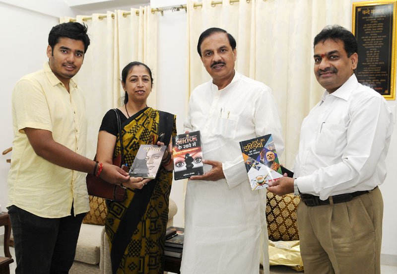 The Minister of State for Culture and Tourism (Independent Charge), Dr. Mahesh Sharma being presented a set of books titled ‘Start Up India’, ‘Smritiyan’ and ‘Aatank Ke Saaye Mein’, by the Author Ms. Garima Sanjay, in New Delhi on September 12, 2016.