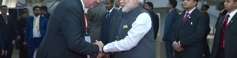 The Prime Minister, Shri Narendra Modi greeting the guest leaders at the Vibrant Gujarat Global Summit 2017, at Mahatma Mandir, in Gandhinagar, Gujarat on January 10, 2017.