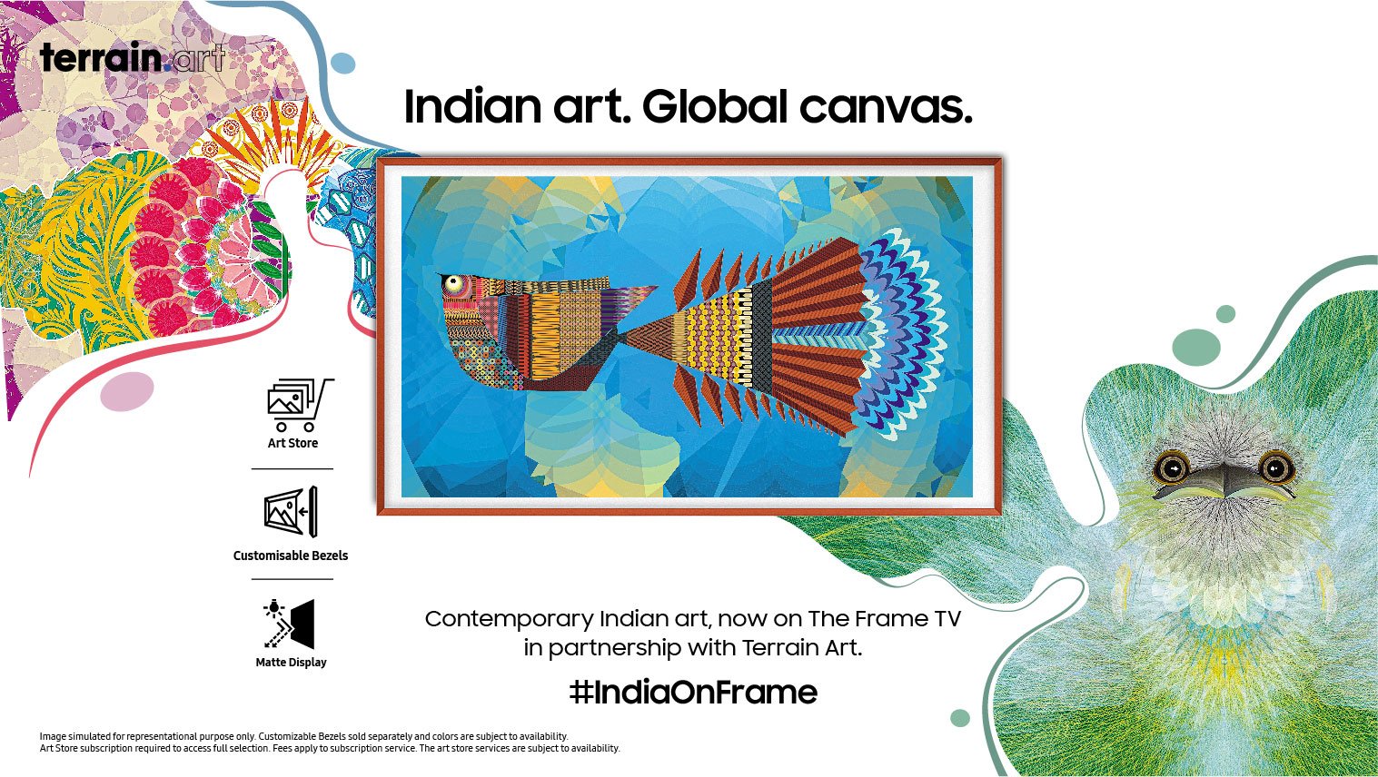 Available on all The Frame TV models, the collection of artworks from Terrain.art has been added to the existing art store that offers more than 2100 artworks. Created by young Indian artists, these newly added artworks are a contemporary take on Indian monuments, folk art, textile traditions, diversity and more. Made with bold brush strokes, vibrant colours, and carefully drawn lines, the artworks present the themes of ecology, futurism, migration, and hope, etc. expressed in a variety of artistic languages.