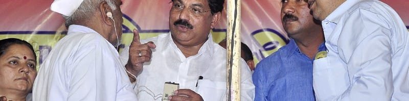 Shri A.T. (Nana) Patil, Member of Parliament Jalgaon, presenting hearing aids to an old man, during the Public Information Campaign, at Chalisgaon, Dist Jalgaon, Maharashtra on September 10, 2015.