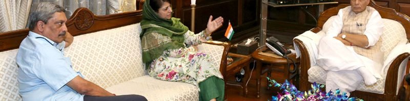 The Chief Minister of Jammu and Kashmir, Ms. Mehbooba Mufti meeting the Union Home Minister, Shri Rajnath Singh and the Union Minister for Defence, Shri Manohar Parrikar, in New Delhi on August 08, 2016.