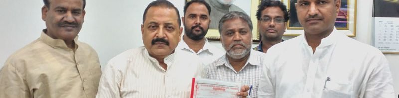 The Minister of State for Development of North Eastern Region (I/C), Prime Minister’s Office, Personnel, Public Grievances & Pensions, Atomic Energy and Space, Dr. Jitendra Singh receiving memorandum from a delegation of Nuclear Power Corporation employees led by the Members of Parliament, Shri C.P. Joshi and Shri Om Birla, in New Delhi on August 03, 2016.