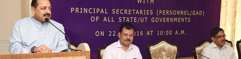 The Minister of State for Development of North Eastern Region (I/C), Prime Minister’s Office, Personnel, Public Grievances & Pensions, Department of Atomic Energy, Department of Space, Dr. Jitendra Singh addressing at the meeting with the Principal Secretaries of the State Governments, in New Delhi on April 22, 2016. The Secretary, DoPT, Shri Sanjay Kothari is also seen.
