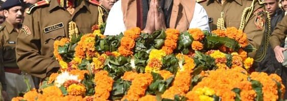 The Minister of State for Information & Broadcasting, Col. Rajyavardhan Singh Rathore paying homage to the martyred constable of the Karkardooma shootout, in New Delhi on December 24, 2015.