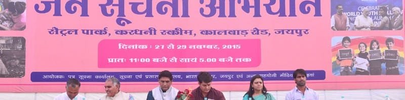The MLA, Chomu, Shri Ram Lal Sharma, Zila Pramukh of Jaipur, Shri Moolchand Meena, the Director, PIB, Jaipur, Smt. Pragya Paliwal Gaur and other dignitaries at the closing ceremony of Public Information Campaign, at Kardhani, in Jaipur on November 29, 2015
