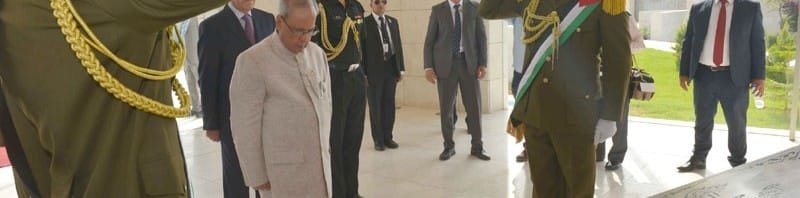 The President, Shri Pranab Mukherjee laying wreath, at Mausoleum of Late President Yasser Arafat, at Ramallah, in Palestine on October 12, 2015