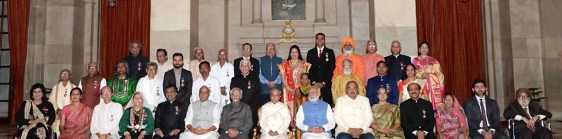 The President, Shri Pranab Mukherjee, the Vice President, Shri M. Hamid Ansari, the Prime Minister, Shri Narendra Modi and the Union Home Minister, Shri Rajnath Singh with the awardees, at a Civil Investiture Ceremony, at Rashtrapati Bhavan, in New Delhi on March 30, 2017.