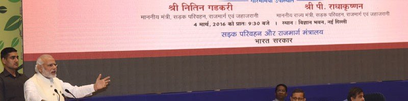 The Prime Minister, Shri Narendra Modi addressing at the launch of the Setu Bharatam– for bridge building to ensure seamless travel on National Highways, in New Delhi on March 04, 2016. The Union Minister for Road Transport & Highways and Shipping, Shri Nitin Gadkari and the Secretary, Ministry of Road Transport and Highways, Shri Sanjay Mitra are also seen