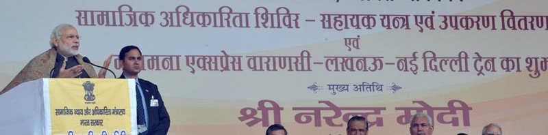 The Prime Minister, Shri Narendra Modi addressing at the Samajik Adhikarita Shivir, in Varanasi, Uttar Pradesh on January 22, 2016. The Union Minister for Micro, Small and Medium Enterprises, Shri Kalraj Mishra, the Minister of State for Railways, Shri Manoj Sinha, the Minister of State for Social Justice & Empowerment, Shri Vijay Sampla and the Secretary, Department of Empowerment of Persons with Disabilities, Shri Lov Verma are also seen.