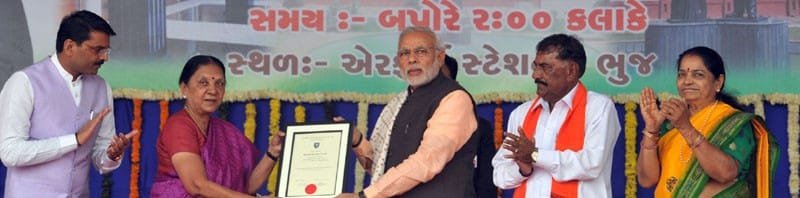 The Prime Minister, Shri Narendra Modi handing over the certificate to the Chief Minister of Gujarat, Smt. Anandiben Patel, marking Shyamji Krishna Varma’s posthumous reinstatement to bar, at a function, at Bhuj, in Gujarat on December 18, 2015.