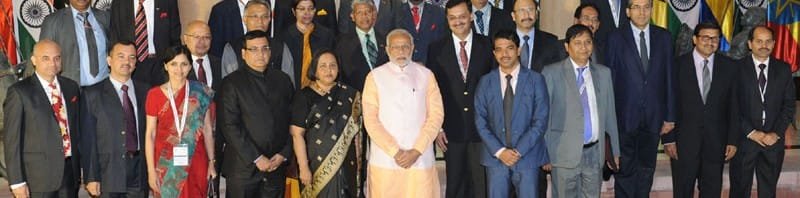The Prime Minister, Shri Narendra Modi in a group photograph with the Indian Ambassadors in Africa..