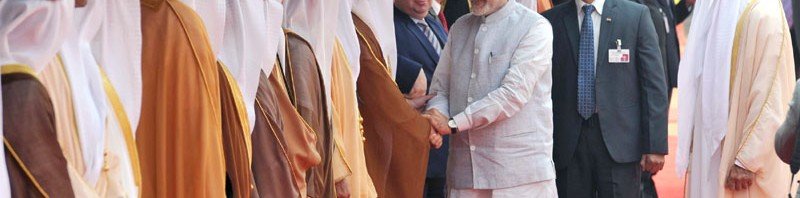 The Prime Minister, Shri Narendra Modi interacting with a delegation accompanying the Crown Prince of Abu Dhabi, His Highness Sheikh Mohammed Bin Zayed Al Nahyan, at the Ceremonial Reception, at Rashtrapati Bhavan, in New Delhi on February 11, 2016.