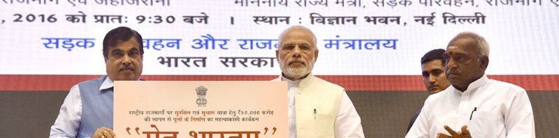 The Prime Minister, Shri Narendra Modi launching the Setu Bharatam– for bridge building to ensure seamless travel on National Highways, in New Delhi on March 04, 2016. The Union Minister for Road Transport & Highways and Shipping, Shri Nitin Gadkari and the Minister of State for Road Transport & Highways and Shipping, Shri P. Radhakrishnan are also seen.