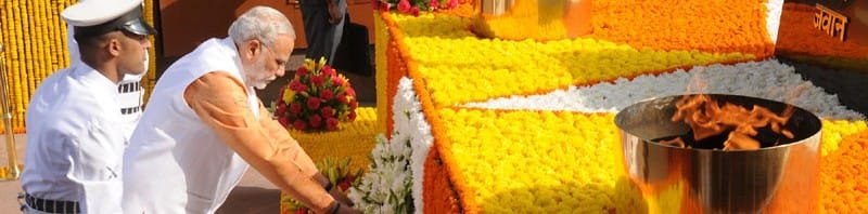 The Prime Minister, Shri Narendra Modi laying wreath at Amar Jawan Jyoti, India Gate,..