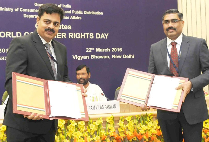 The Union Minister for Consumer Affairs, Food and Public Distribution, Shri Ram Vilas Paswan witnessing the signing ceremony of MoUs between Department of Consumer Affairs and the industry bodies to promote the consumer welfare, at the release of the self regulatory code for Industry and a joint campaign for consumer protection in the presence of industry bodies, in New Delhi on March 22, 2016.