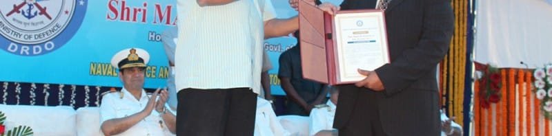 The Union Minister for Defence, Shri Manohar Parrikar presented the National Award to the Secretary Dept. of Defence RD and Director General of DRDO, Dr. S. Christopher, at Visakhapatnam on November 14, 2015.