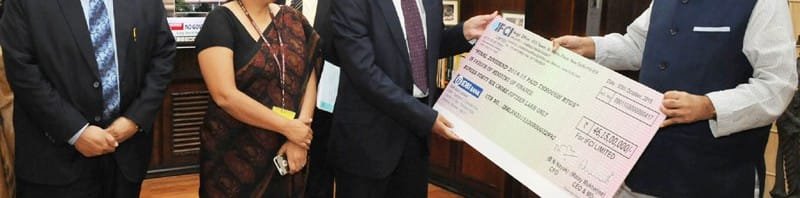 The Union Minister for Finance, Corporate Affairs and Information & Broadcasting, Shri Arun Jaitley being presented a dividend cheque by the CEO & MD, Industrial Finance Corporation of India (IFCI), Shri Malay Mukherjee, in New Delhi on October 16, 2015.