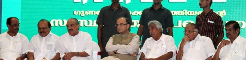 The Union Minister for Finance, Corporate Affairs and Information & Broadcasting, Shri Arun Jaitley, the Chief Minister of Kerala, Shri Oommen Chandy and other dignitaries at the State level declaration of Karunya Benevolent fund accomplishment, in Cochin, Kerala on September 10, 2015