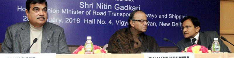 The Union Minister for Road Transport & Highways and Shipping, Shri Nitin Gadkari, the Union Minister for Finance, Corporate Affairs and Information & Broadcasting, Shri Arun Jaitley and the Chairman of National Highways Authority of India (NHAI), Shri Raghav Chandra at the Interactive Session with the Highways Sector Stakeholders, in New Delhi on January 28, 2016.