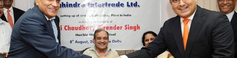 The Union Minister for Steel, Shri Chaudhary Birender Singh witnessing the signing ceremony of the Joint Venture Agreement between MSTC Ltd. and Mahindra Intertrade Ltd. for setting up of first Auto Shredding Plant in India, in New Delhi on August 08, 2016. The Secretary, Ministry of Steel, Dr. Aruna Sharma is also seen.