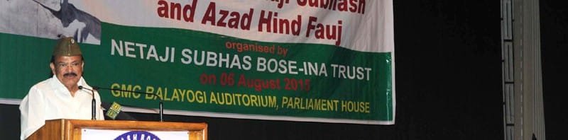 The Union Minister for Urban Development, Housing and Urban Poverty Alleviation and Parliamentary Affairs, Shri M. Venkaiah Naidu addressing at the National Conclave of Legacy of Netaji Subhash and Azad Hind Fauj, in New Delhi on August 06, 2015. The Speaker, Lok Sabha, Smt. Sumitra Mahajan, the Minister of State for Culture (Independent Charge), Tourism (Independent Charge) and Civil Aviation, Dr. Mahesh Sharma and other dignitaries are also seen.