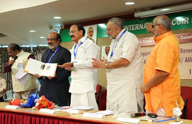 The Union Minister for Urban Development, Housing & Urban Poverty Alleviation and Information & Broadcasting, Shri M. Venkaiah Naidu releasing a Coffee Table Book and the Minister of Finance and Coir, Government of Kerala, Shri. T.M. Thomas Isaac, received the first copy, on the occasion of the Reverse Buyer-Seller Meet organised as part of the India International Coir Trade fair 2016 and Agri Intex 2016, at CODISSIA Trade Fair Complex, in Coimbatore, Tamil Nadu on July 17, 2016. The Minister of State for Micro, Small & Medium Enterprises, Shri Giriraj Singh and the Chairman, Coir Board, Shri. C.P. Radhakrishnan are also seen