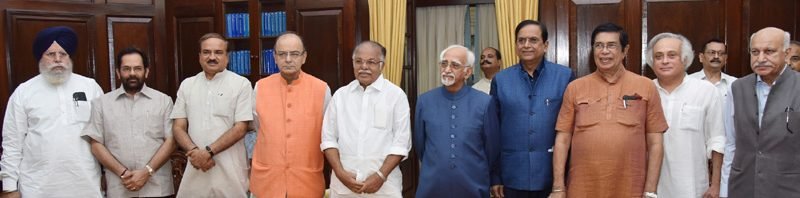 The Vice President and Chairman, Rajya Sabha, Shri M. Hamid Ansari with the newly elected Members of Rajya Sabha, Shri Oscar Fernandes, Shri Jairam Ramesh, Shri M.J. Akbar and Shri Satish Chandra Misra, at a Swearing-in Ceremony, at Parliament House, in New Delhi on July 08, 2016. The Deputy Chairman, Rajya Sabha, Shri P.J. Kurien, the Union Minister for Finance and Corporate Affairs, Shri Arun Jaitley, the Union Minister for Chemicals & Fertilizers and Parliamentary Affairs, Shri Ananth Kumar, the Minister of State for Minority Affairs and Parliamentary Affairs, Shri Mukhtar Abbas Naqvi and the Minister of State for Agriculture and Farmers Welfare, Shri S.S. Ahluwalia are also seen.